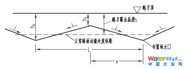 設(shè)置鋸齒形偏溝,雖然能夠保證縱向排水的要求,但施工比較麻煩,影響道路的美觀,且在偏溝寬度范圍內(nèi)不利于車輛的平穩(wěn)行駛,目前設(shè)計(jì)已較少采用。