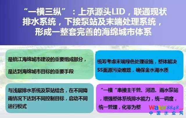 針對(duì)鎮(zhèn)江城市老城區(qū)雨污合流和CSO溢流問題、初期雨水污染問題和河道治理問題的現(xiàn)狀需求,加上海綿城市年徑流總量控制率、年徑流污染控制率和內(nèi)澇防治的三大目標(biāo)要求,源頭綠色LID充分建設(shè)仍然滿足不了水質(zhì)水量耦合目標(biāo),中心提出沿金山湖多功能大口徑管道系統(tǒng)方案,對(duì)現(xiàn)狀管網(wǎng)灰色系統(tǒng)進(jìn)行有效補(bǔ)充,完成區(qū)域海綿城市建設(shè)目標(biāo),建設(shè)科學(xué)合理完善的海綿城市工程體系和聯(lián)合運(yùn)行調(diào)度體系,實(shí)現(xiàn)海綿城市建設(shè)的系統(tǒng)集成創(chuàng)新。
