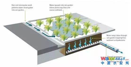 雨水花園是一個(gè)術(shù)語(yǔ),通常被用于描述一個(gè)植被繁茂的區(qū)域,從雨水徑流當(dāng)中去除污染物質(zhì)(也稱為生物滯留系統(tǒng))。雨水流入到花壇中,通過(guò)一層工程土進(jìn)行過(guò)濾。凈水被收集在有溝槽的管道中并引到傳統(tǒng)的排水系統(tǒng)中。這個(gè)表面會(huì)留住雨水徑流中的垃圾、樹(shù)葉和沉積物,同時(shí)土壤(和植物根部系統(tǒng)結(jié)合)幫助過(guò)濾和分解微觀污染物例如營(yíng)養(yǎng)物、重金屬和碳?xì)浠衔。設(shè)計(jì)雨水花園是利用它在頻繁的低強(qiáng)度降雨中過(guò)濾污染物。傳統(tǒng)的排水系統(tǒng)依然需要適應(yīng)稀少的較大型降水,防止洪澇災(zāi)害。
