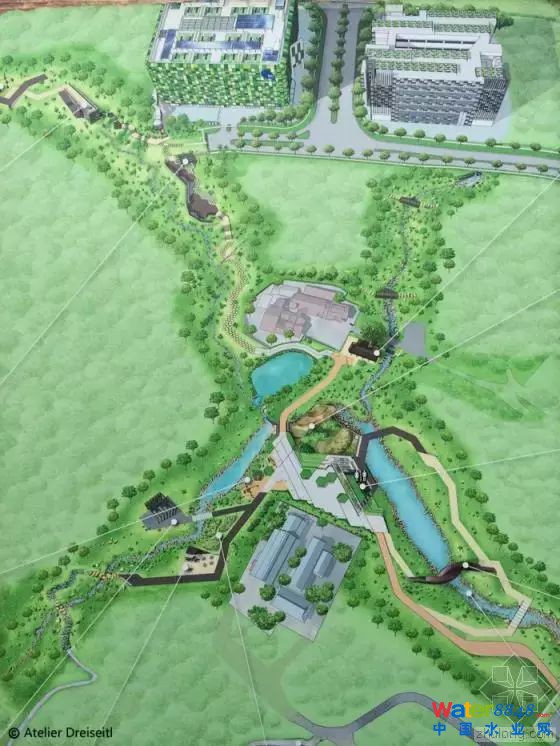 現(xiàn)有的生態(tài)棲息地,包括草地、林地和泥炭沼澤區(qū)都被盡可能地保留,F(xiàn)存的野生動(dòng)物物種被記錄,通過(guò)增加的植被種植,為野生動(dòng)植物提供食物和棲息地,將場(chǎng)地與更大范圍的周邊環(huán)境相連,特別是跨越南洋大道的北部森林區(qū)域,自然野生動(dòng)物廊道功能被增強(qiáng)。同樣,自然地形會(huì)被盡可能多地加以保留,并與新加坡公用事業(yè)局的“活躍、美觀、潔凈”(Active,Beautiful,Clean)水域方案理念相呼應(yīng)。該ABC水域方案將被實(shí)施,以支持場(chǎng)地內(nèi)現(xiàn)有的水文流動(dòng)。生態(tài)洼地將凈化雨水,并將之從路邊排水渠道引流至中央核心區(qū)。在那里,一系列的沼澤和池塘將收集和保存雨水。這些雨水將通過(guò)生態(tài)凈化群落加以循環(huán),以進(jìn)行進(jìn)一步的凈化,被重新利用成為廁所沖刷用水。