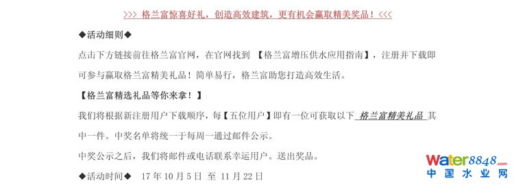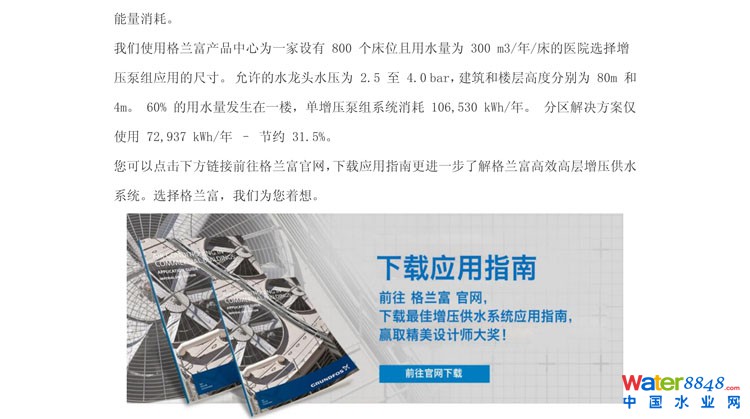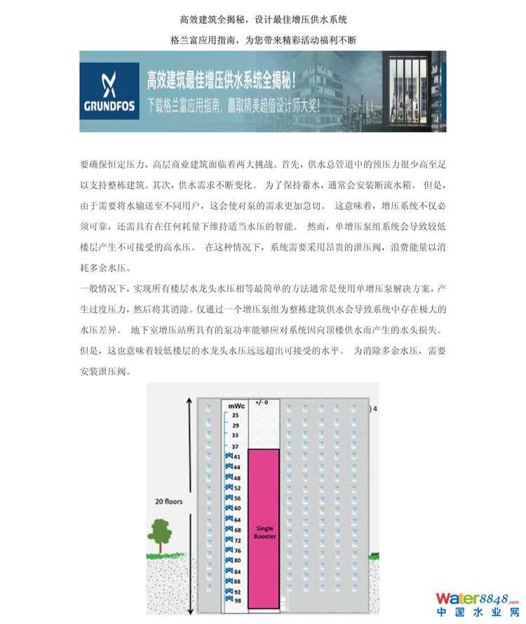 點擊原文鏈接,大獎等您拿! (點擊原文按照格蘭富 公司的要求填好信息后將姓名、單位、地址、手機號 等信息發(fā)到 13752275003@163.com ,可以另外獲得 中國給水排水2017年中國污水處理廠提標(biāo)改造高級研討會 論文集1本 ) http://cn.grundfos.com/grundfos-for-engineers/featured-themes/intelligent-pump-solutions-in-commercial-buildings/single-booster-vs-zone-divided-booster-systems.html?cmpid=ba:watergasheat:cbsengineer:gsh