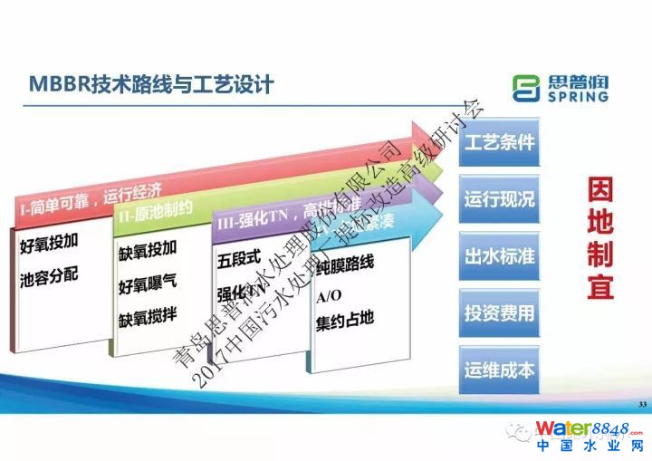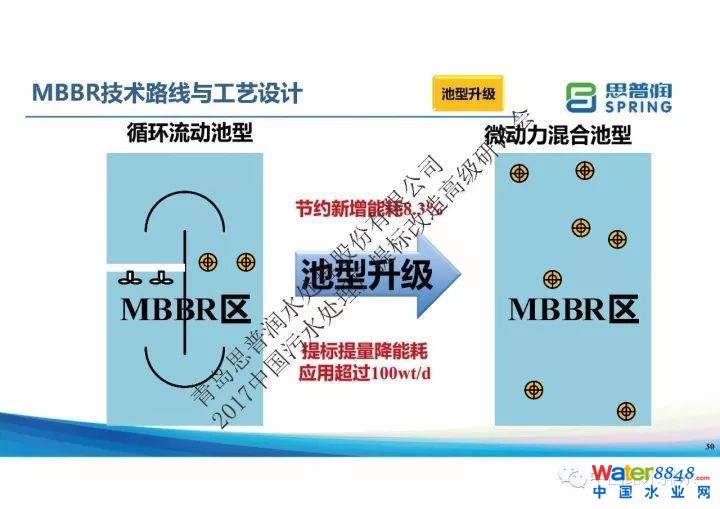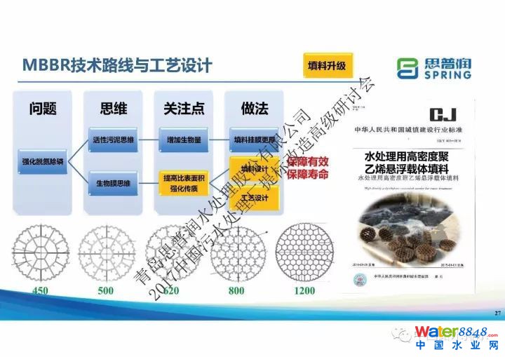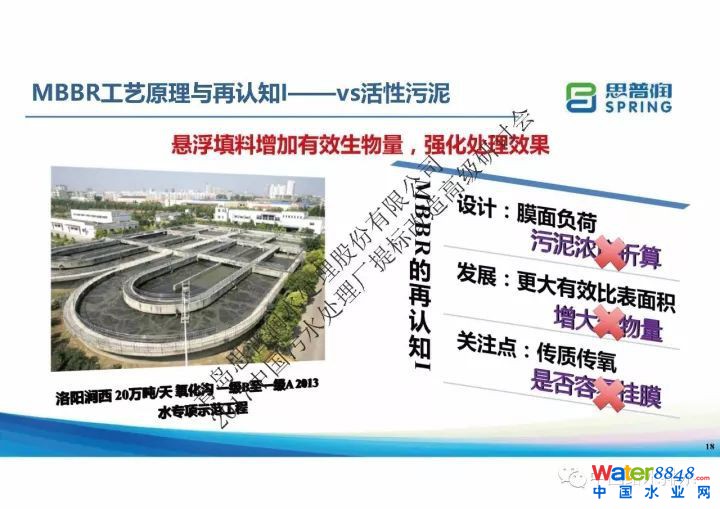 第二個(gè)是介紹MBBR的工藝原理與再認(rèn)知。我們一想到生化工藝,最初想到的就是活性污泥法,此技術(shù)已經(jīng)發(fā)展百年,所以我們總習(xí)慣拿活性污泥法跟MBBR工藝作比較。實(shí)際它跟活性污泥法有聯(lián)系也有區(qū)別。首先說聯(lián)系方面,它們的動(dòng)力來源相同,好氧階段都是通過爆氣實(shí)現(xiàn),MBBR技術(shù)的泥膜負(fù)荷工藝有污泥回流,運(yùn)行方式、工藝布置流程相似。再說區(qū)別方面,傳統(tǒng)活性污泥法由于通過剩余污泥排放控制泥齡,是一個(gè)單泥齡系統(tǒng);MBBR工藝是一個(gè)雙泥齡的系統(tǒng),有固定態(tài)泥齡也有懸浮態(tài)泥齡,一定程度可以緩解脫氮除磷泥齡上面矛盾。傳統(tǒng)的活性污泥法微生物是階段培養(yǎng),比如硝化菌群在好氧曝氣階段實(shí)現(xiàn)增殖恢復(fù),在缺氧段又受到抑制;而MBBR是一個(gè)專性和連續(xù)的培養(yǎng)過程,生物膜在固定區(qū)域流化培養(yǎng)。MBBR工藝中的微生物固定在填料上,強(qiáng)沖擊來臨時(shí),整個(gè)的菌群系統(tǒng)不受影響,沖擊過后整個(gè)系統(tǒng)的效能能很快恢復(fù)。再一個(gè)就是溶解氧不同,傳統(tǒng)的活性污泥法在溶解氧大于2毫克/L時(shí)硝化功能就不受溶解氧影響,此時(shí)是一個(gè)零級(jí)反應(yīng);而MBBR工藝可以看到隨著溶解氧的增加有兩個(gè)明顯區(qū)域,不同溶解氧水平下不光有零級(jí)反應(yīng),也有一級(jí)反應(yīng)的區(qū)間。綜上所述我們認(rèn)為懸浮填料MBBR工藝泥齡控制方式和活性污泥法不同,抗沖擊原理不同,微生物培養(yǎng)方式不同,溶解氧傳質(zhì)的方式不同,硝化菌群所含的比例不同,硝化菌群比例一般大于10%,最多可以超過70%。所以我們認(rèn)為懸浮填料是增加和持留有效生物量、強(qiáng)化處理效果,而不僅僅是認(rèn)為就是增加了MLSS。