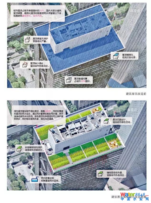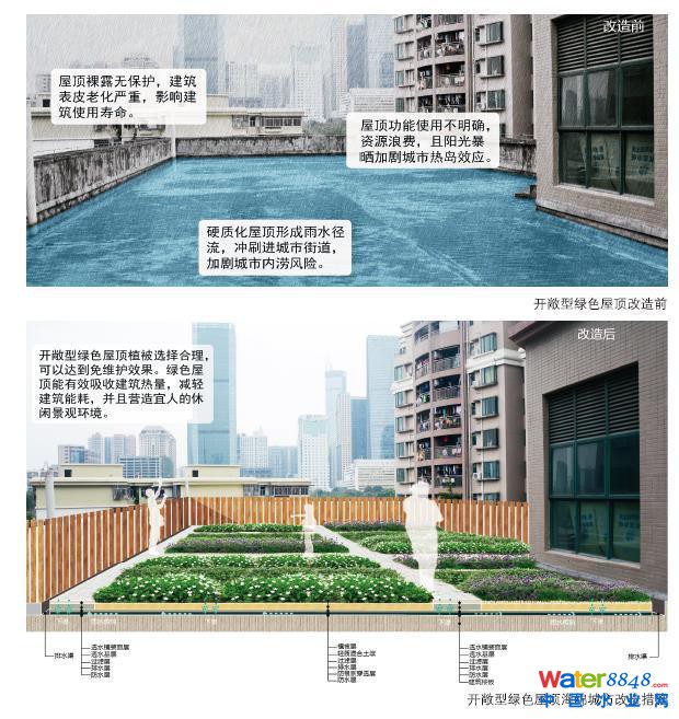 雨洪來(lái)臨時(shí),建筑屋頂產(chǎn)生的徑流是導(dǎo)致城市內(nèi)澇的重要原因之一。因此,將城市的建筑屋頂改造為綠色屋頂能有效緩解城市雨水徑流壓力。一方面,通過(guò)海綿城市結(jié)構(gòu)來(lái)收集、儲(chǔ)存雨水,并利用雨水進(jìn)行澆灌,可以節(jié)省各種能耗;另一方面,綠色屋頂將形成良好的城市景觀,提升城市的整體綠化率。