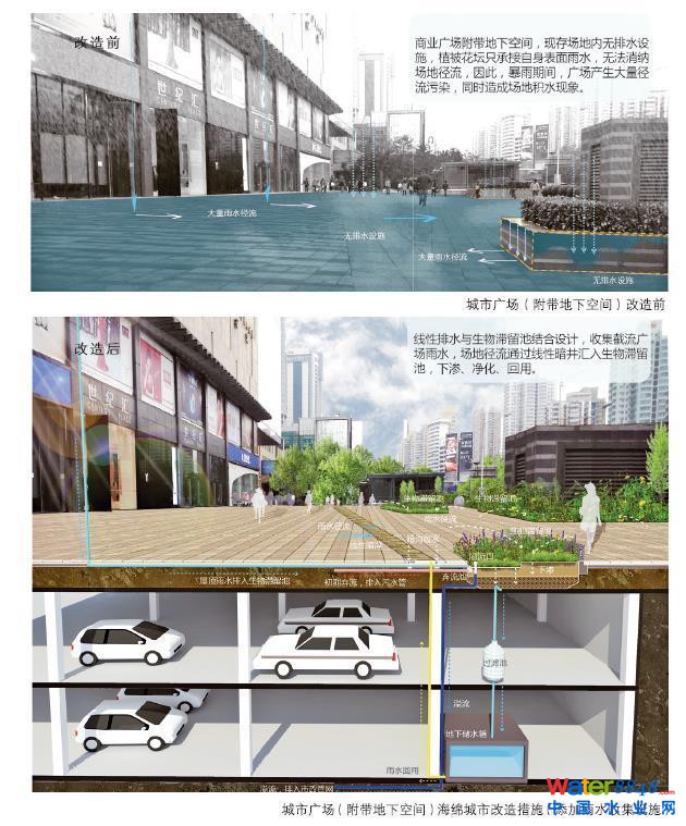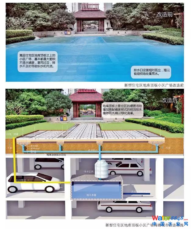 高層住宅區(qū)中的硬質(zhì)廣場(chǎng)可以結(jié)合透水鋪裝、排水明溝及生物滯留設(shè)施,設(shè)計(jì)成一個(gè)集收集、凈化、儲(chǔ)存雨水于一體的良性循環(huán)系統(tǒng)。