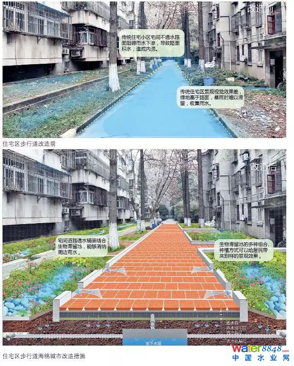 傳統(tǒng)住宅區(qū)中的宅間道路和綠化帶可以改造成透水路面和生物滯留池,用來(lái)收集道路上的雨水,避免路面雨水沉積對(duì)居民生活造成影響。
