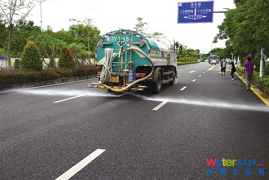 灑水車剛剛?cè)鲞^的路面沒有一點兒積水