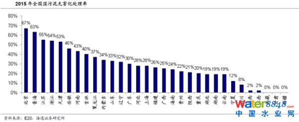 2015 年新建污泥無害化處理能力520 萬噸/年,同比增長41%。全國濕污泥平均無害化處理率32%,北京(67%)、青海(63%)、江蘇(55%)位列前三,西藏(0%)、甘肅(0%)、新疆(0%)位列后三。