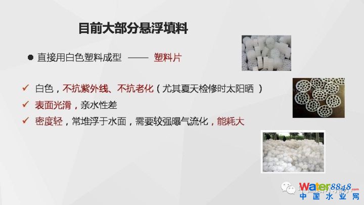 目前的懸浮填料,大部分用白色塑料直接加工,可以說,就是白色的塑料片,它有很多弊端,不抗紫外線,不抗老化,尤其夏天檢修時間長時太陽暴曬老化更快,表面光滑,親水性差,密度輕,常堆浮水面需要較強曝氣流化,能耗大。