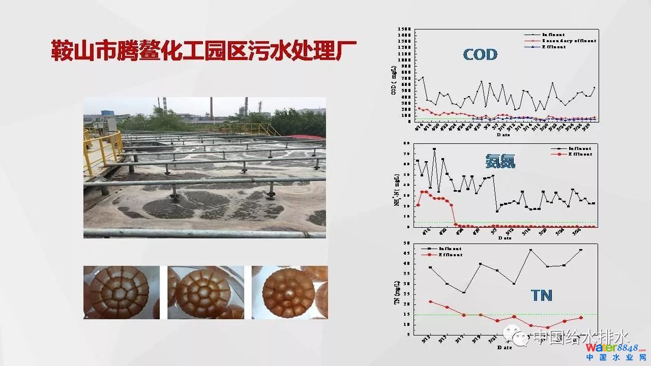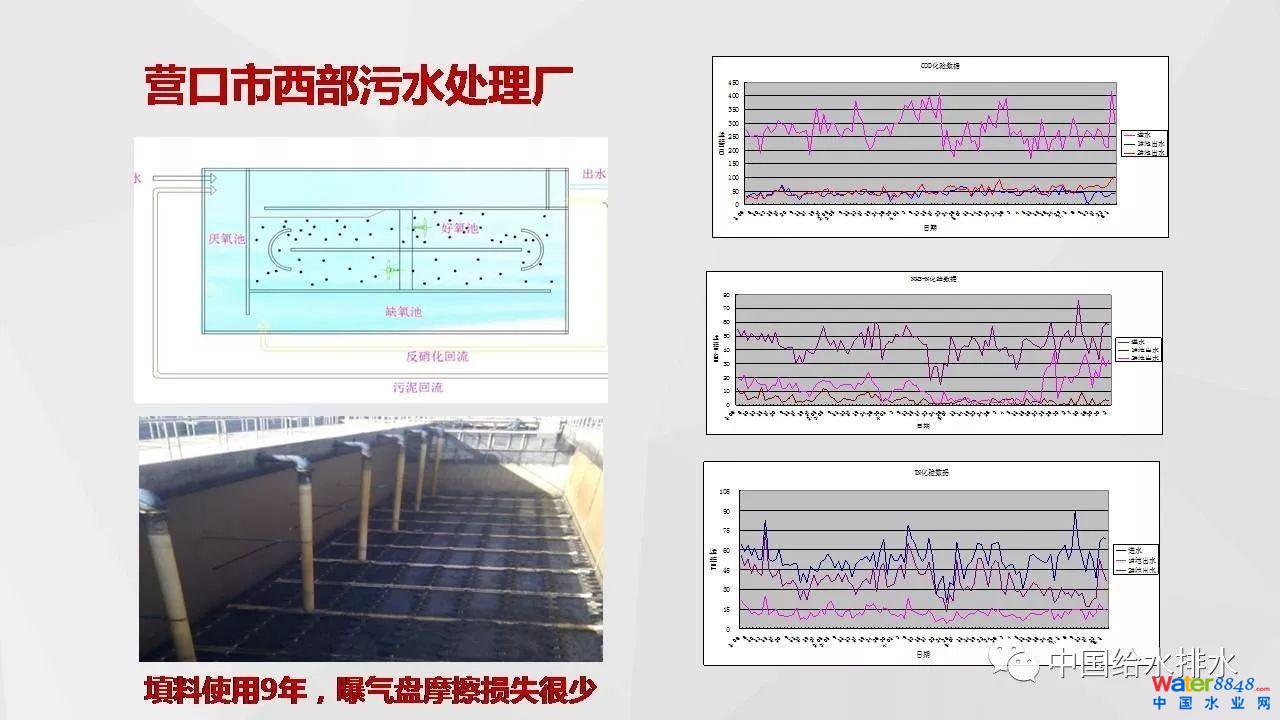 它的工藝是這樣的,下圖左上方的圖,在好氧池第一廊道和第二廊道投放填料,用推進器推動疏導,讓填料在池內循環(huán),不在網(wǎng)前堆積。下圖右面3個圖,改造后COD,氨氮,總氮出水穩(wěn)定達到一級A,尤其冬季水溫在8攝氏度左右時,都能穩(wěn)定達標。