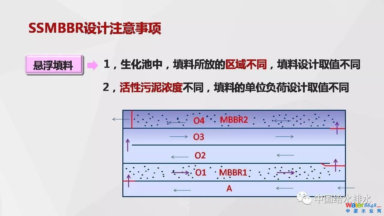 一、生化池中,填料所投放的區(qū)域不同,填料的設計取值就不同。(如下圖)好氧池中,填料投放在第一個廊道O1和最后一個廊道O4,填料所承載的硝化負荷是不同的,有時相差非常大,因此設計時,準確取值填料負荷非常重要,否則,會因填料量不足不能達標,或者,因填料量太多而浪費。二、系統(tǒng)內活性污泥濃度的設定不同,填料的負荷取值不同,這個比較好理解,因為填料上的微生物和活性污泥有競爭關系。