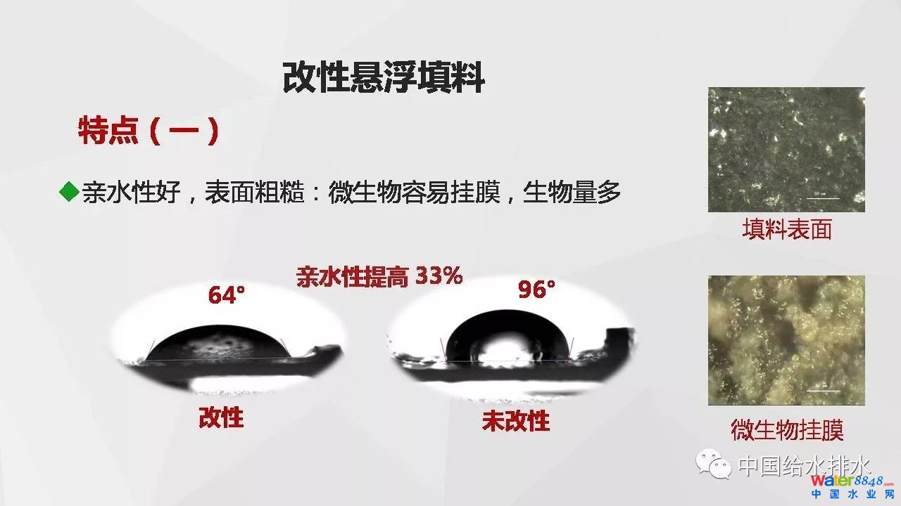 改性懸浮填料 有以下顯著特點,一、親水性好,表面粗糙,微生物容易掛膜,生物量多。親水性改性后,水和填料的接觸角是64°,改性前,水和填料的接觸角度是96°。親水性提高了33%,以下是電鏡照片。