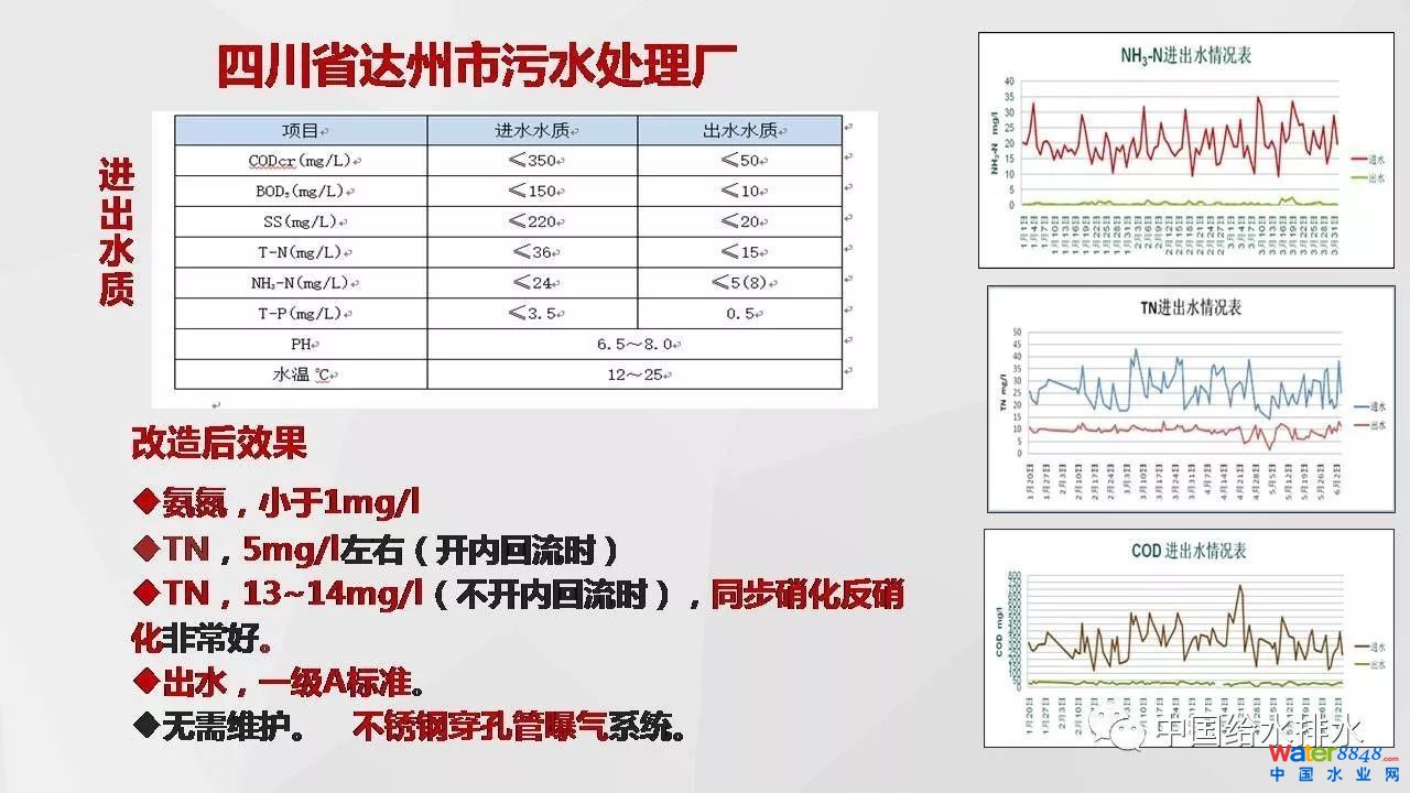 四川達州市污水處理廠2013年完成,水量4/8萬噸,它的原工藝,是UNITANK工藝,改造后(A2O+填料) SSMBBR工藝,改造后出水達到一級A,它的底部曝氣, 是不銹鋼穿孔曝氣,永久性的,無需維護檢修。