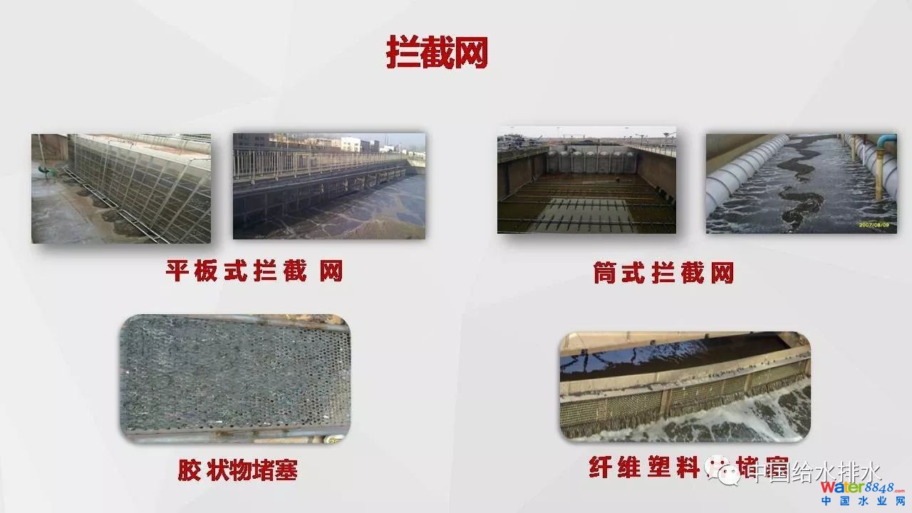 SSMBBR工藝第二部分:攔截網(wǎng)。它的作用是攔截填料流失,同時避免纖維等雜物堵塞攔截網(wǎng)。攔截網(wǎng)分平板式攔截網(wǎng)和筒式攔截網(wǎng)。左圖是平板式攔截網(wǎng),右圖是筒式攔截網(wǎng),攔截網(wǎng)的設計非常重要。生化池前面雖然有粗細格柵,但是,水在生化反應后,經(jīng)常有膠狀物產(chǎn)生,如左下方的圖,并且有頭發(fā)絲、纖維塑料片等隨著進水刮風流入系統(tǒng),堵塞攔截網(wǎng),如右下方的圖,所以網(wǎng)前要有自清洗系統(tǒng),防止堵塞攔截網(wǎng)。