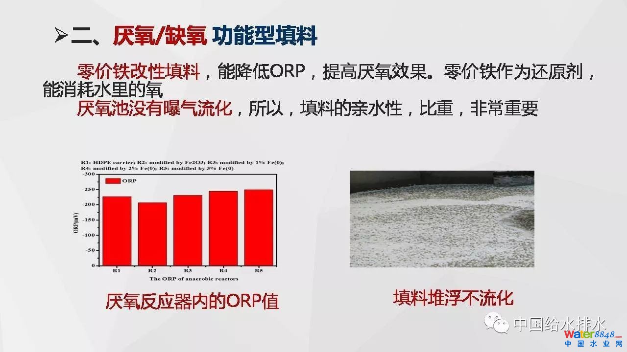 第二種是厭氧/缺氧功能型填料。零價鐵改性,能降低ORP,提高厭氧效果。因厭氧池沒有曝氣,所以,填料的親水性和比重非常重要。厭氧池內填料是靠攪拌器推動流化,如果親水性不好,比重輕,填料會堆浮在上面,如右下圖,需要大功率攪拌器推動流化,這樣不僅能耗高,而且空氣中的氧會隨著水流的波動溶進水里,降低厭氧效果。所以,厭氧/缺氧功能填料的親水性和比重,對于好的流化是非常重要的。