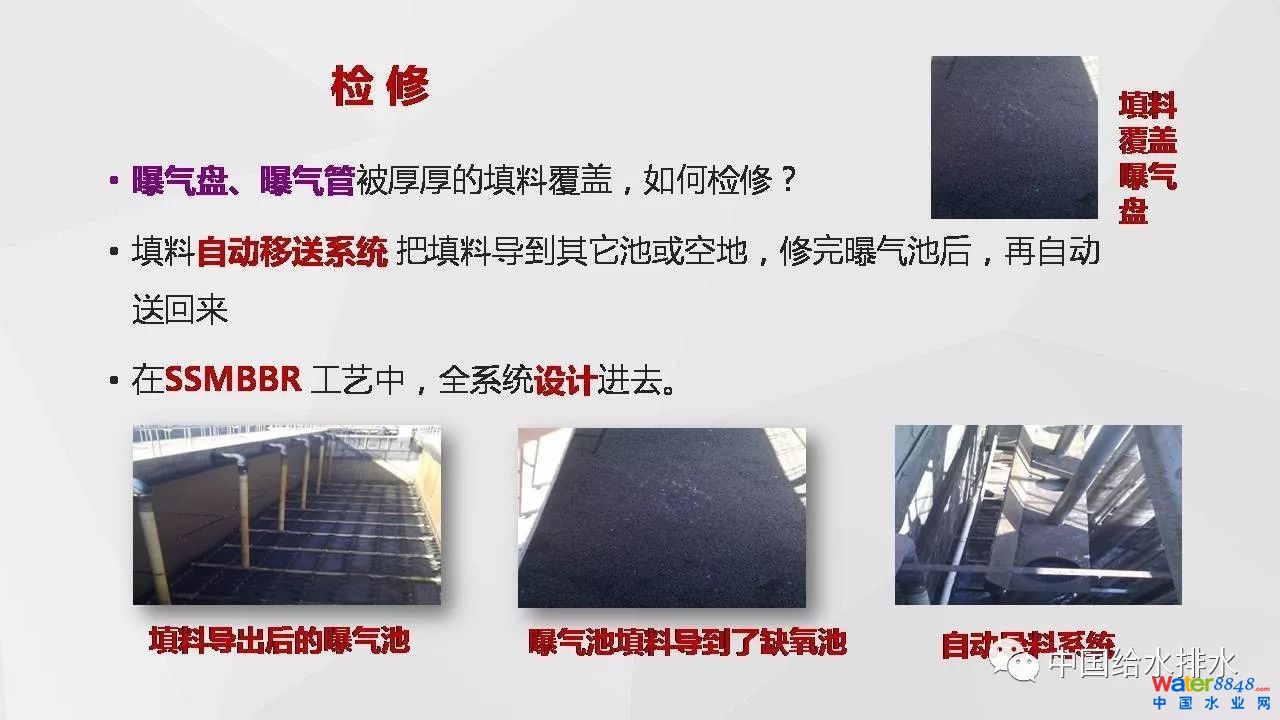 第四部分:填料移送自動化。自動地把填料從池子導出來,檢修池底。曝氣盤,曝氣管被厚厚填料覆蓋,如下面圖的右上方圖,如何檢修呢。自動移送系統(tǒng),可以把填料導到其它池子或空地,修完曝氣后再自動導回來,SSMBBR工藝中,已經(jīng)全部設計進去了。