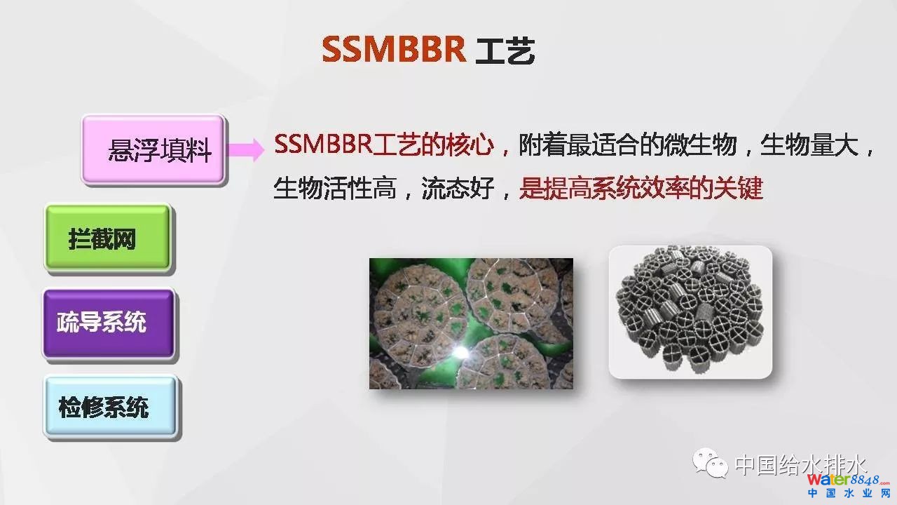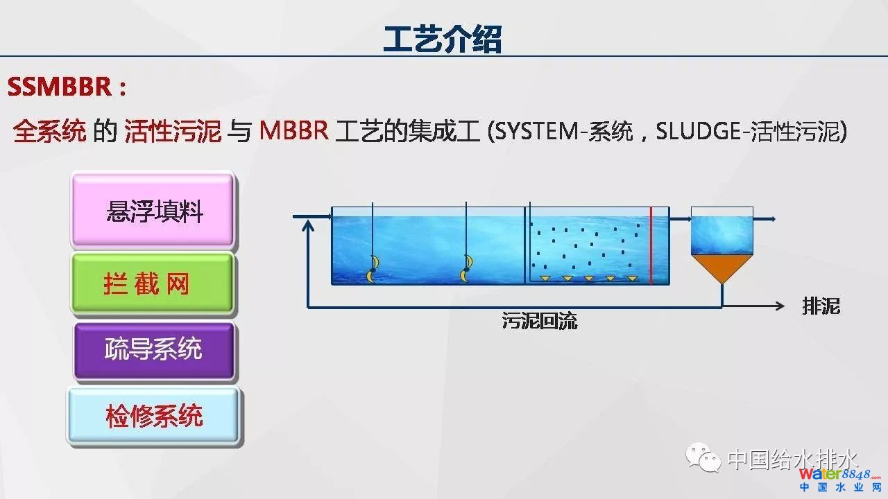 今天給大家重點講的是SSMBBR工藝,它是全系統(tǒng)的活性污泥和MBBR工藝的集成工藝。第一個S-SYSTEM是指系統(tǒng),第二個S-SLUDGE是指活性污泥,它是IFAS工藝的一種,包括活性污泥之外還包括懸浮填料,攔截網(wǎng),疏導系統(tǒng)和檢修系統(tǒng)。