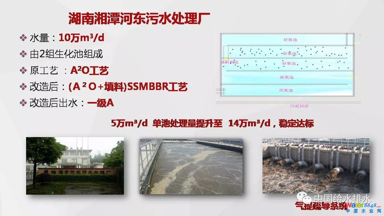 湖南湘潭污水處理廠,水量10萬噸,由2組生化池組成,原工藝A2O工藝,改造后A2O+填料SSMBBR工藝,改造后出水:一級A。