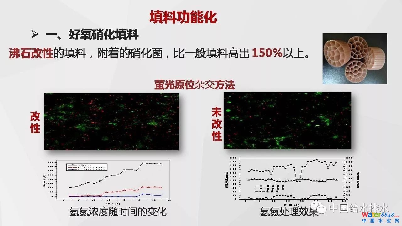第一種是好氧硝化填料。它是沸石改性的填料,附著的硝化菌,比一般填料高出1.5倍以上,大大提高了氨氮的去除能力,以下這兩張圖,是通過螢光原位雜交方法,對改性填料和未改性填料上的硝化菌群進行分析的。