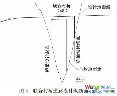 本工程道路依次穿越萬溶江、跳巖河、焦柳鐵路、X047縣道、聯(lián)合村深溝,均通過橋梁的形式穿越,橋梁段道路縱坡如圖3~圖5所示?梢钥闯觯降爻鞘信c平原城市相比,河道底或深溝底同道路設(shè)計(jì)標(biāo)高差較大,最深處達(dá)25 m以上。