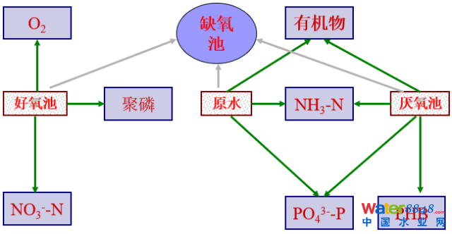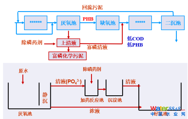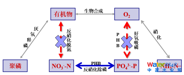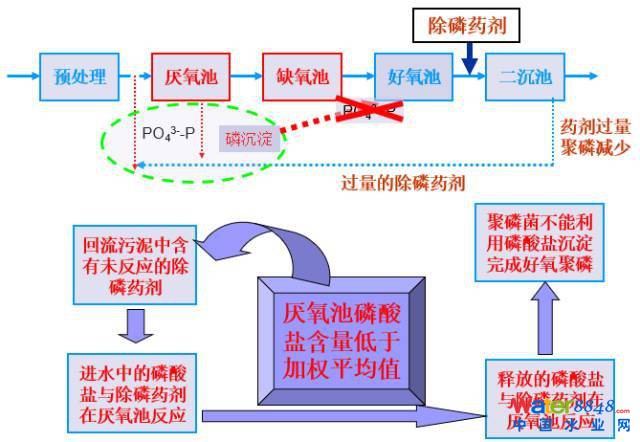 上述實(shí)驗(yàn)數(shù)據(jù)為我們推斷為什么化學(xué)協(xié)同除磷污水處理廠厭氧池不釋磷提供了一定的數(shù)據(jù)基礎(chǔ)。根據(jù)上述數(shù)據(jù),我們就能知道雖然我們是在二沉池投加的,但是到了好氧末端,磷酸鹽濃度相對(duì)是比較低的,此時(shí)除磷藥劑是過(guò)量的,那么過(guò)量的藥劑首先是與污泥發(fā)生絮凝沉淀反應(yīng),而后隨著回流污泥進(jìn)入到厭氧池中,這時(shí)候即使厭氧池有釋磷功能或現(xiàn)象,所釋放的磷酸鹽也要與除磷藥劑發(fā)生化學(xué)反應(yīng),生成磷酸鹽沉淀。也就是說(shuō)化學(xué)協(xié)同除磷污水處理廠的厭氧池出來(lái)的混合液實(shí)際上是沒(méi)有磷酸鹽,或者低磷酸鹽的。而后這些混合液進(jìn)入到好氧池,就沒(méi)有辦法完成吸磷了,因?yàn)闆](méi)有磷酸鹽可以吸了。那么既然不能吸磷了,后續(xù)自然也沒(méi)法釋磷了,因?yàn)獒屃资且葬屃姿a(chǎn)生PHB作為驅(qū)動(dòng)力的。然后好氧池不吸磷,自然也沒(méi)有“聚磷”產(chǎn)生,自然后續(xù)也就沒(méi)法“釋磷”。也就是說(shuō)厭氧釋磷與好氧吸磷是互相的,影響其一反應(yīng),必將影響到另一個(gè)反應(yīng)。