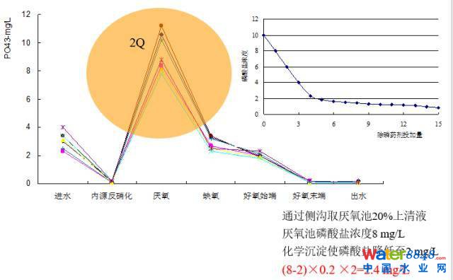 既然化學(xué)協(xié)同除磷已經(jīng)影響了我們生物除磷功能,那么似乎我們的厭氧/好氧模式也就會(huì)受到影響了,就需要考慮一定的應(yīng)對(duì)或補(bǔ)救措施。為此,我們對(duì)以前部分專(zhuān)家也提到過(guò)的厭氧池側(cè)流除磷進(jìn)行了一定的工程研究。大家都知道,我們沒(méi)有化學(xué)協(xié)同除磷的時(shí)候,很多污水處理廠厭氧池都有比較高的磷酸鹽濃度,基于這個(gè)濃度大概測(cè)算一下,如果把厭氧池20%到30%的混合液拿出來(lái)做化學(xué)除磷處理,這樣會(huì)去除2-5毫克升的磷酸鹽去除量,基于此提出一個(gè)化學(xué)除磷理念。