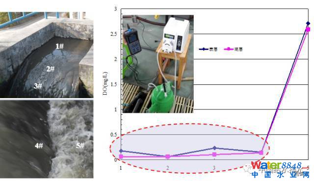 那么到底為什么跌水會(huì)形成這么高一個(gè)復(fù)氧水平,我們開(kāi)始也咨詢(xún)了很多業(yè)內(nèi)專(zhuān)家,很多專(zhuān)家認(rèn)為不可能,有的專(zhuān)家認(rèn)為我們測(cè)試方法有問(wèn)題,有的提出說(shuō)我們的研究結(jié)論跟國(guó)際上的相關(guān)說(shuō)法不太一致,為此也給我們提出了很多進(jìn)一步研究和驗(yàn)證的建議。為此,我們就選擇實(shí)際工程,進(jìn)行了相關(guān)的生產(chǎn)性測(cè)試。在南方某污水處理廠泵池出口的跌水區(qū)選擇了5個(gè)檢測(cè)點(diǎn),如圖中所示,其中4號(hào)和5號(hào)點(diǎn)分別位于跌水前和跌水后的區(qū)域。分別對(duì)5個(gè)點(diǎn)的表層水和深層水進(jìn)行了溶解氧的測(cè)試,結(jié)果表明,1~ 4號(hào)點(diǎn)表層和深層的溶解氧沒(méi)有明顯差別,證明表面復(fù)氧量相對(duì)較小。但是4號(hào)和5號(hào)之間出現(xiàn)明顯差別,也就是說(shuō)跌水點(diǎn)前后出現(xiàn)明顯的溶解氧濃度差。