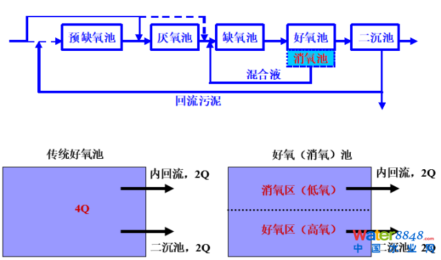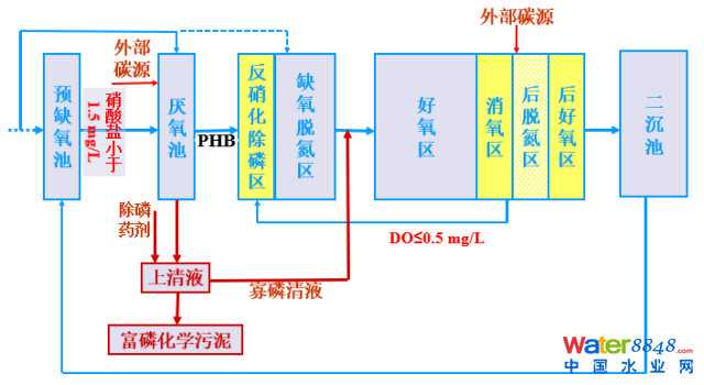 那么,回到工程上我們?cè)趺磸?qiáng)化,我們建議在常規(guī)缺氧池前端單獨(dú)做一段出來(lái),作為反硝化除磷池使用。在這個(gè)所謂反硝化除磷池里,我們不加入原水或外加碳源,解決有機(jī)物的競(jìng)爭(zhēng)問(wèn)題;另外,回流混合液來(lái)自于消氧池,解決溶解氧的抑制問(wèn)題,當(dāng)然如果回流的混合液仍存在一定的溶解氧,只是會(huì)局部影響反硝化除磷效果。