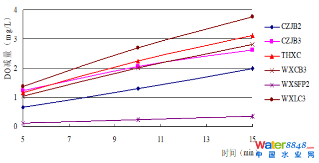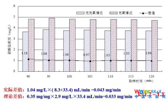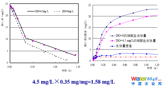 那么這個(gè)內(nèi)回流混合液到底對(duì)缺氧池,或者說(shuō)對(duì)我們的脫氮量是什么影響,可否量化。我們也查閱了一些資料,發(fā)現(xiàn)當(dāng)時(shí)文獻(xiàn)表述不多,為此我們也希望能建立一個(gè)理論計(jì)算公式,首先大家都比較清楚,根據(jù)氧化還原反應(yīng)的電子關(guān)系理論計(jì)算結(jié)果,每1 mg的溶解氧會(huì)影響0.35mg的硝酸鹽氮去除量。那么我們首先進(jìn)行了一下靜態(tài)實(shí)驗(yàn),驗(yàn)證一下這個(gè)0.35是否成立,方法很簡(jiǎn)單,就是兩個(gè)燒杯,一個(gè)有4.5 mg/L的溶解氧濃度,一個(gè)基本上沒(méi)有。攪拌并連續(xù)監(jiān)測(cè)硝酸鹽濃度,并繪制曲線計(jì)算兩個(gè)反應(yīng)器內(nèi)硝酸鹽去除量的差值。結(jié)果發(fā)現(xiàn)實(shí)驗(yàn)差值高于我們根據(jù)理論推導(dǎo)出的1.58 mg/L理論差值,表明還有其他因素影響,需要研究修正系數(shù)。