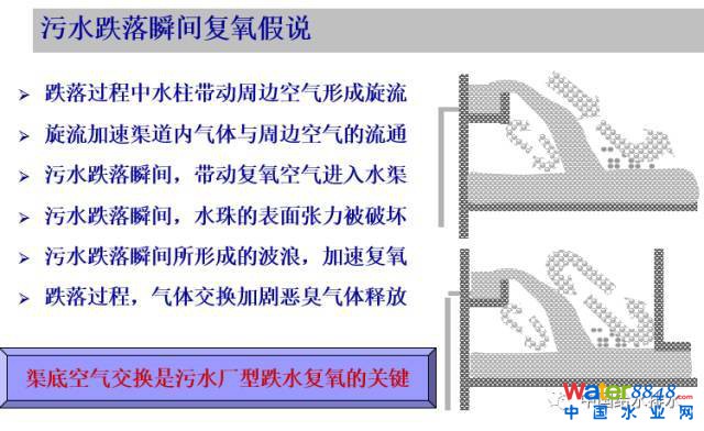 為了進(jìn)一步說(shuō)明跌水復(fù)氧產(chǎn)生的原因,我們提出了一個(gè)污水跌落瞬間復(fù)氧的假說(shuō),并通過(guò)一定的測(cè)試手段進(jìn)行了驗(yàn)證。首先,受水的表面張力影響,污水跌落過(guò)程中的表面復(fù)氧現(xiàn)象并不明顯,但是跌落的過(guò)程會(huì)帶動(dòng)周邊空氣運(yùn)動(dòng),并在半封閉的跌水池中形成旋流,通過(guò)這種旋流實(shí)現(xiàn)了跌水池內(nèi)氣體與外界大氣的溝通與置換,因此跌水池內(nèi)空氣中的氧含量并不低。另外,旋流的空氣會(huì)隨著跌水過(guò)程進(jìn)入到跌水池的污水里面,與此同時(shí)跌水形成的巨大沖擊力導(dǎo)致水珠的表面張力被破壞,使氧更容易與水混合。這可能是跌水復(fù)氧形成的最重要原因。