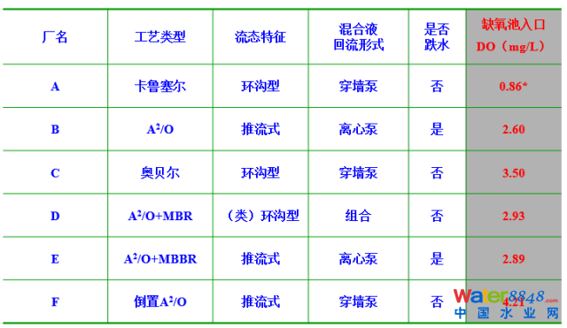 上述是關(guān)于跌水復(fù)氧方面的研究成果,那么第二部分給大家介紹一下我們?cè)趦?nèi)回流混合液溶解氧控制方面的研究成果和最新進(jìn)展。今天也有部分專(zhuān)家提到過(guò)這個(gè)問(wèn)題,看來(lái)這個(gè)問(wèn)題越來(lái)越引起大家的關(guān)注了,這部分的研究成果我們也是2015年發(fā)表在《中國(guó)給水排水》11月的期刊上了。當(dāng)然也要感謝《中國(guó)給水排水》編輯部及各位評(píng)委和讀者,該論文還在2016年獲得了《中國(guó)給水排水》編輯部的一個(gè)論文特等獎(jiǎng)。這個(gè)事情也很簡(jiǎn)單,大家都知道我們好氧池的混合液是有兩個(gè)出口的,一個(gè)要到二沉池,一個(gè)是要回流到缺氧池,這兩個(gè)出口通常是不分開(kāi)的。為了避免二沉池反硝化浮泥,通常會(huì)在好氧池末端保持相對(duì)較高的溶解氧水平,那么這樣相當(dāng)于是回流到缺氧池的混合液也具有相對(duì)較高的溶解氧水平,從而導(dǎo)致缺氧池不缺氧的現(xiàn)象。下表是我對(duì)部分污水處理廠的測(cè)試結(jié)果。