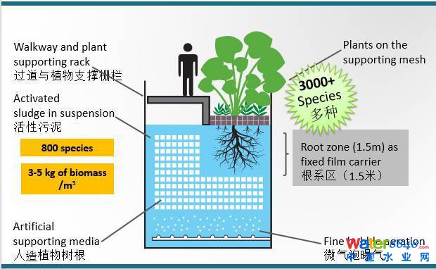 奧尼卡工藝的介紹,在傳統(tǒng)工藝方案的反應(yīng)池上加上植物支撐,過道,以及植物。植物的本身并不處理污水,我們是利用它的根系,根系就是一個載體的類型,生物膜法提供一個生物附著地方,因?yàn)橹参锔荡罅康谋缺砻娣e所以附著生物量非常大,FCR反應(yīng)池大概五米深左右,為了這個池的容積,植入人工載體,植物根系新陳代謝作用使這個池里面微生物種類從八百種上升到三千種,生物質(zhì)的總量也從3-5公斤上升到8-12公斤。