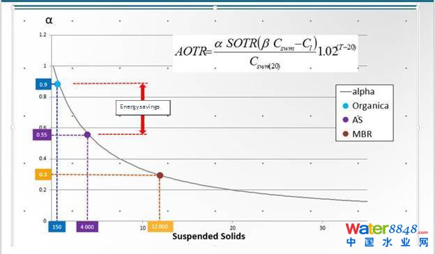 這是一個溶氧效率曲線,橫軸的TSS于縱軸溶氧效率α的關(guān)系圖,MBR的TSS比較高,所以α值最低,FCR的TSS最低,所以α最高,越高氧氣傳遞的利用就越高,需要的空氣就越少也就越節(jié)約能源,請看下面兩張圖片對于能量,占地面積的對比。