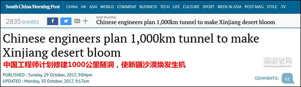 香港《南華早報》10月30日報道,中國工程師正在測試一項用于1000公里引水隧洞工程的技術。如果技術上可行,從西藏引水入新疆就可能成為現(xiàn)實。