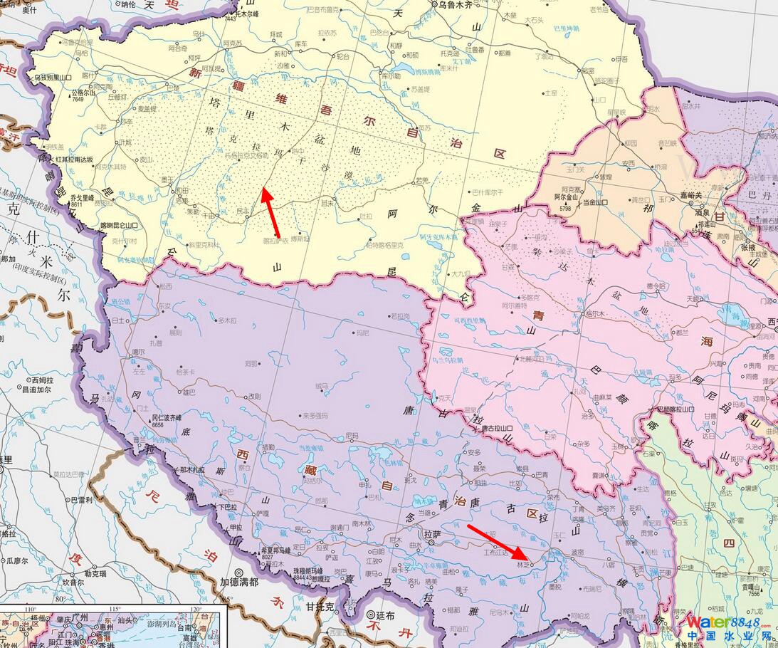 箭頭處分別為塔克拉瑪干沙漠和雅魯藏布江