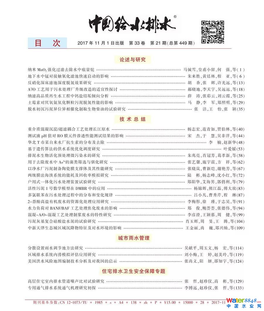 摘要:利用納米MnO2強化石英砂和錳砂過濾去除水中痕量重金屬鉈,考察了去除效能以及競爭性Ca2+和絡(luò)合性腐殖酸(HA)對強化過程的影響。投加48 μmol/L的納米MnO2對常規(guī)石英砂過濾體系具有良好的強化效果,出水水質(zhì)能達到國家飲用水標準;由于錳砂本身具有良好的過濾去除效能,在相同的納米MnO2投加量下并沒有表現(xiàn)出很好的強化能力。競爭性Ca2+和絡(luò)合性HA對強化混凝有一定影響,投加5 mmol/L的Ca2+在一定程度上降低了對痕量重金屬的去除效能,10 mg/L的腐殖酸則顯著抑制了重金屬的去除,大大增加了出水中殘余Tl的濃度。 總體來看,高價態(tài)鉈由于受到腐殖酸的絡(luò)合作用,強化過濾去除效能較低,即氧化過程不利于強化過濾去除痕量鉈。