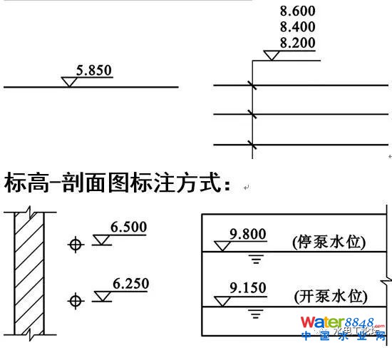 4、圖紙沒(méi)有特別說(shuō)明,一般情況下:給水管標(biāo)注的是管道中心標(biāo)高,排水管標(biāo)注的是管道底標(biāo)高。