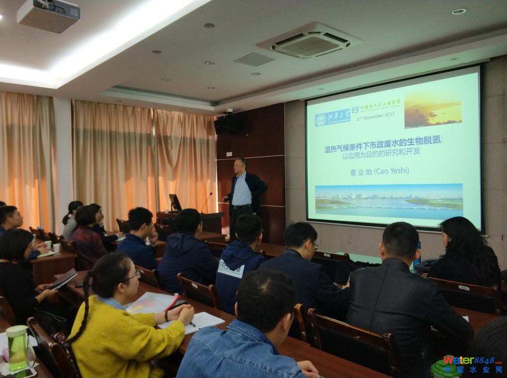 曹業(yè)始博士進(jìn)行了題為“溫?zé)釟夂驐l件下市政廢水的生物脫氮—以應(yīng)用為目的的研究和開發(fā)”的學(xué)術(shù)報(bào)告,介紹了溫?zé)釟夂驐l件下市政廢水的生物脫氮的背景、傳統(tǒng)活性污泥脫氮過程開發(fā),并詳細(xì)闡述了新加坡樟宜污水處理廠主流厭氧氨氧化工藝的應(yīng)用實(shí)例。曹業(yè)始博士指出,溫暖氣候條件下人們對(duì)污水處理廠好氧池池容的錯(cuò)誤認(rèn)識(shí)及“水力停留時(shí)間越長(zhǎng)硝化效果越好”的觀點(diǎn)對(duì)污水處理廠設(shè)計(jì)與運(yùn)行存在較大影響,只有深入污水處理廠一線現(xiàn)場(chǎng)進(jìn)行取樣試驗(yàn),結(jié)合理論基礎(chǔ)與確切數(shù)據(jù)才能對(duì)掌握污水處理廠設(shè)計(jì)與運(yùn)行的精髓。曹業(yè)始博士通過大量的實(shí)驗(yàn)數(shù)據(jù)獲得了溫暖氣候地區(qū)的活性污泥脫氮工藝的最佳脫氮設(shè)計(jì)參數(shù),還對(duì)目前中國(guó)市政污水生物處理存在的一些緊迫問題提出了自己看法和意見。曹業(yè)始博士專業(yè)的知識(shí)構(gòu)架、敏銳的思維、幽默風(fēng)趣的講解得到了老師和同學(xué)們的一致贊揚(yáng),現(xiàn)場(chǎng)學(xué)術(shù)氣氛極為活躍,學(xué)術(shù)交流會(huì)達(dá)到了預(yù)期效果,師生們拓寬了視野,尤其是對(duì)污水脫氮這一方面有了更加深刻的了解。