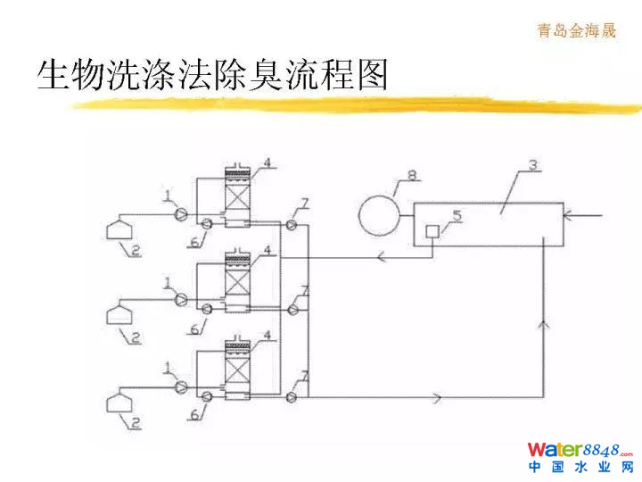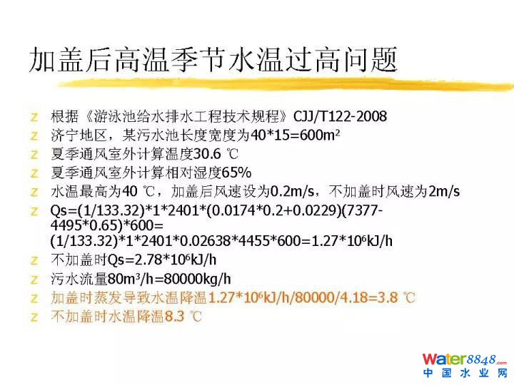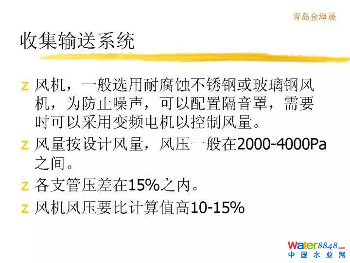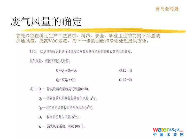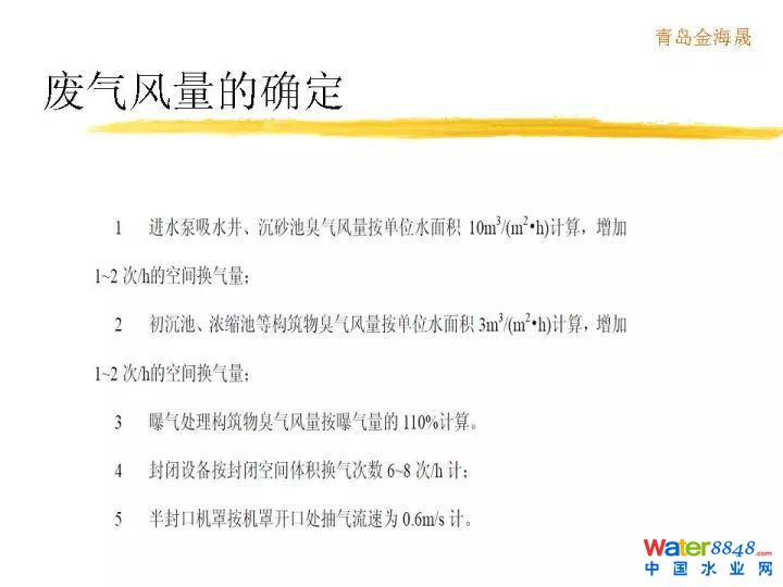 廢氣風(fēng)量的確定,首先是滿足生產(chǎn)工藝要求,消防,安全,職業(yè),衛(wèi)生都得到滿足前提下,然后我們盡量減少通風(fēng)量,提高廢氣濃度。為下一步回收還有凈化來提供方便。做完以后廢氣量怎么確定?各個(gè)不同的池子,不是采用完全一樣的通風(fēng)量,基本按照水面面積來核算。我們知道所有的廢氣都是在水面上揮發(fā),沒有水面就沒有揮發(fā)。所以這個(gè)進(jìn)水泵房,吸水井,沉砂池每小時(shí)每平方米水面10立方廢氣量。污水管道到這個(gè)地方一跌水,昨天孫主任講一跌水會(huì)復(fù)氧。實(shí)際上一跌水除了復(fù)氧還會(huì)什么后果?就是里面溶解的臭氣會(huì)揮發(fā)出來。這個(gè)臭氣濃度非常高。前面一段選取比較大的通風(fēng)量。后續(xù)一平方米1小時(shí)3立方足夠了,還包括其他的。比如格柵機(jī),污泥脫水機(jī)盡量外面加通風(fēng)罩密閉起來,密閉空間一小時(shí)8次換氣次數(shù)用的比較多的。
