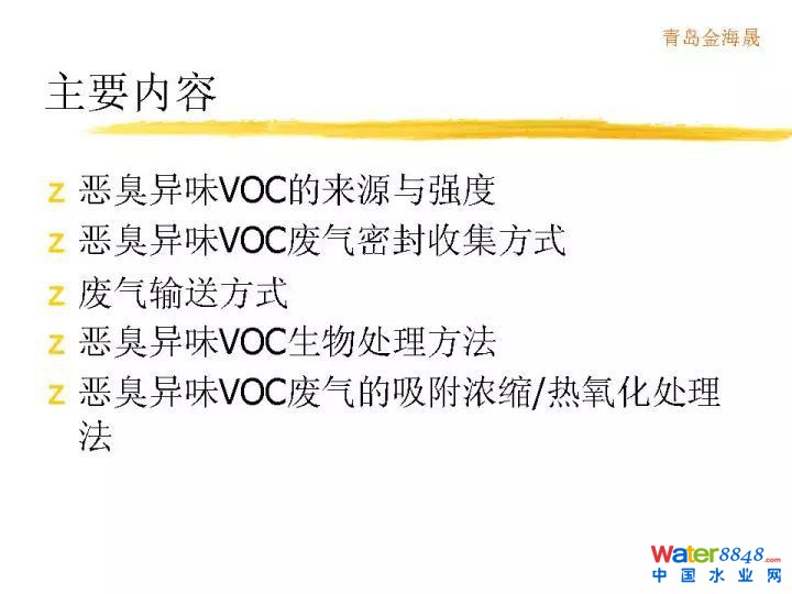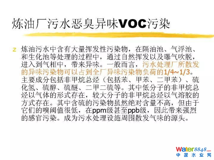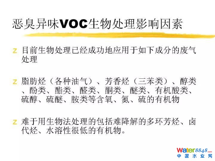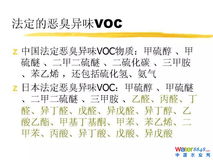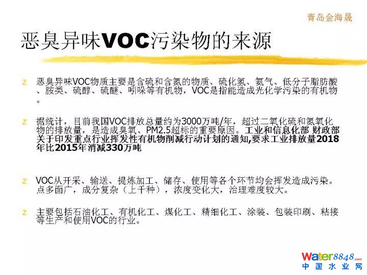 我想講的主要內(nèi)容一個(gè)惡臭異味VOC的來源和強(qiáng)度,再一個(gè)就是處理的技術(shù),剛才創(chuàng)業(yè)環(huán)保同行提出了全流程技術(shù)。我們認(rèn)為如果這個(gè)氣體已經(jīng)揮發(fā)出來,就必須密閉進(jìn)行收集處理。收集完要輸送,之后進(jìn)行處理。惡臭異味成分基本含硫含氮,城市污水里面主要包含蛋白質(zhì),氨基酸等含氮,含硫這樣的物質(zhì)經(jīng)過厭氧,產(chǎn)生硫化氫、氨氣、低分子脂肪酸等等異味廢氣。VOC目前排放量非常大,都會(huì)帶來氣味。帶來霧霾,還有臭氧超標(biāo)很重要的問題。這些帶有異味的揮發(fā)的VOC,揮發(fā)性的有機(jī)物都是必須要進(jìn)行嚴(yán)加處理的。中國(guó)法定惡臭異味VOC有如下這些。