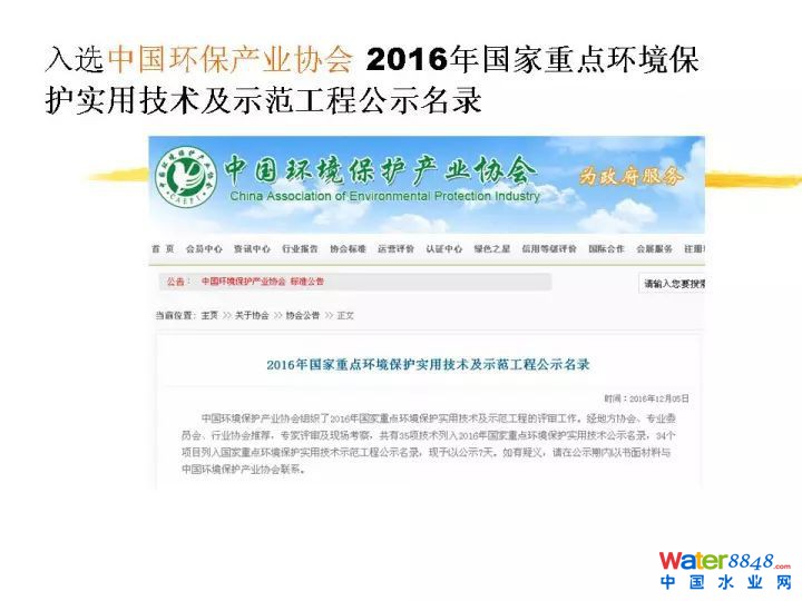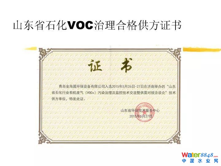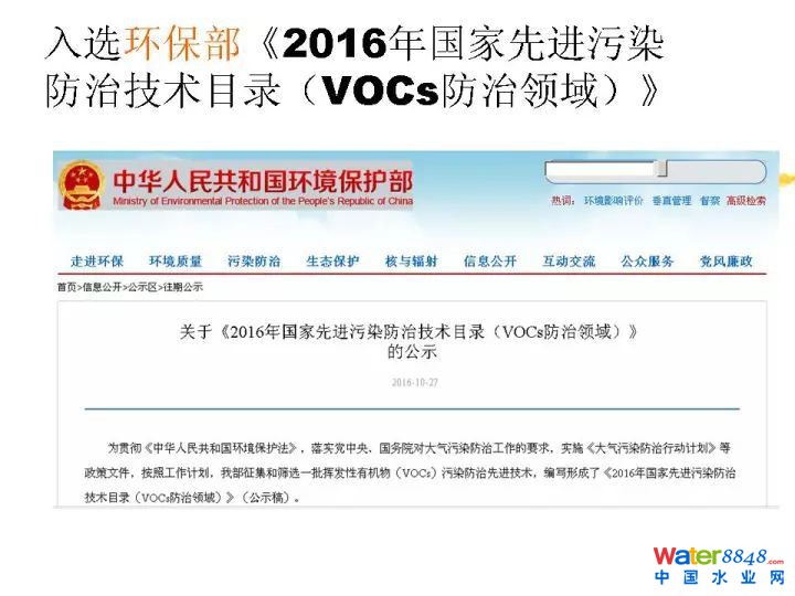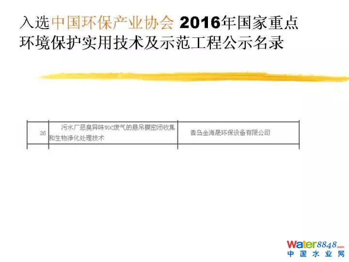 這是我們的通過9000,14000的認(rèn)證,這是我們獲得中國(guó)環(huán)境保護(hù)產(chǎn)品的認(rèn)證。非常榮幸跟大家通報(bào)一下,去年2016年的時(shí)候,我們國(guó)家環(huán)保部做了一個(gè)2016年的國(guó)家先進(jìn)污染防治技術(shù)目錄。霧霾天越來越重,環(huán)保部非常著急征集治理技術(shù),我們技術(shù)很榮幸入選了環(huán)保部的先進(jìn)污染防治技術(shù)目錄。這里大家可以看到,就是污水污泥處置過程當(dāng)中惡臭異味廢氣處理技術(shù)。同時(shí)入選中國(guó)環(huán)保產(chǎn)業(yè)協(xié)會(huì)2016年的國(guó)家重點(diǎn)環(huán)境保護(hù)實(shí)用技術(shù)及示范工程的目錄。這也是我們獲得的一點(diǎn)點(diǎn)的認(rèn)可。這是污水處理廠惡臭異味的凈化技術(shù)。我下面還會(huì)詳細(xì)介紹。這些都是我們的獲得榮譽(yù),不多講了。