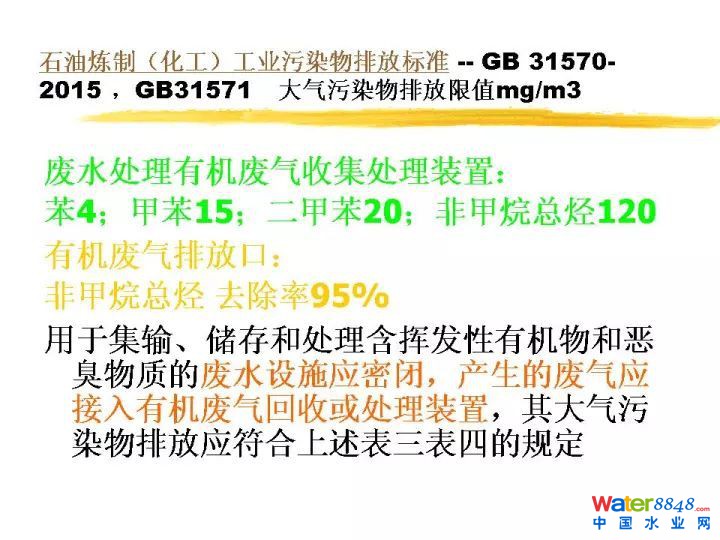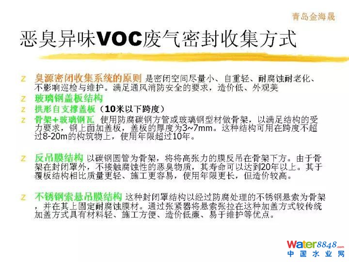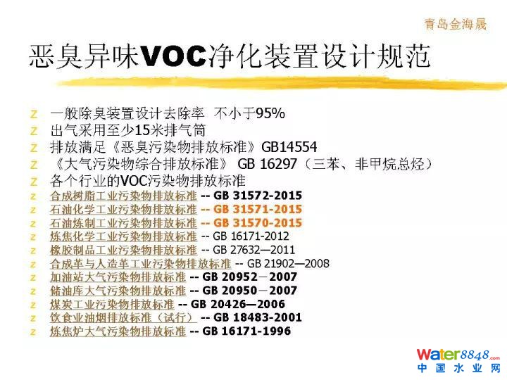 關(guān)于廢氣設(shè)計(jì)濃度,一般污水處理廠硫化氫大概1到10,氨氣0.5到5mg/m3,臭氣濃度1000到5000。按照這樣設(shè)計(jì)濃度情況下市政污水處理廠的臭氣不是難題,比較環(huán)保。難的是一些工業(yè)的污水,里面含有各種各樣的工業(yè)污染物。惡臭異味VOC凈化裝置要滿足如下有關(guān)設(shè)計(jì)規(guī)范。這個(gè)城市污水要滿足惡臭污染物排放標(biāo)準(zhǔn)。再有滿足《城市污水處理廠污染物排放標(biāo)準(zhǔn)》。這個(gè)標(biāo)準(zhǔn)除了對(duì)水指標(biāo)提出要求,對(duì)臭氣也提出要求。這些都要同時(shí)滿足。各種各樣工業(yè)的在這里列好多工業(yè)的排放標(biāo)準(zhǔn)。我們這里也有可能好多做工業(yè)污水的。工業(yè)的這一個(gè)廢氣也提出來很多要求,特別是石油化學(xué)工業(yè)。石油煉制工業(yè)污染物排放標(biāo)準(zhǔn),這個(gè)排放標(biāo)準(zhǔn)非?量獭1热缥覀?cè)谶@里提了,這一個(gè)石油煉制工業(yè),石油化學(xué)工業(yè)這個(gè)收集標(biāo)準(zhǔn)是用于集輸,儲(chǔ)存和處理含揮發(fā)性有機(jī)物和惡臭異味廢水設(shè)施應(yīng)密閉。產(chǎn)生廢氣應(yīng)接入有機(jī)廢氣回收處理裝置。這些難度相對(duì)更大一些。這是煉油廠污水惡臭污染物排放標(biāo)準(zhǔn),我們也做了不少這類項(xiàng)目。