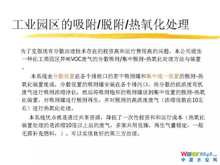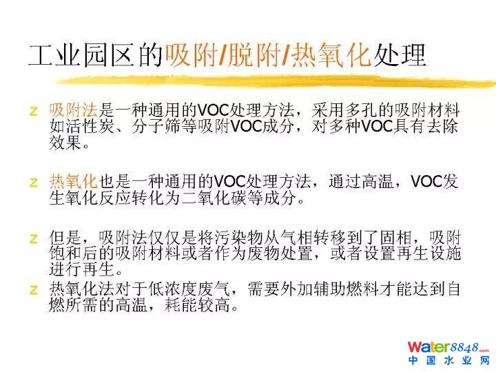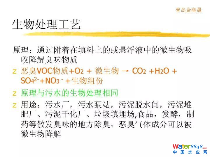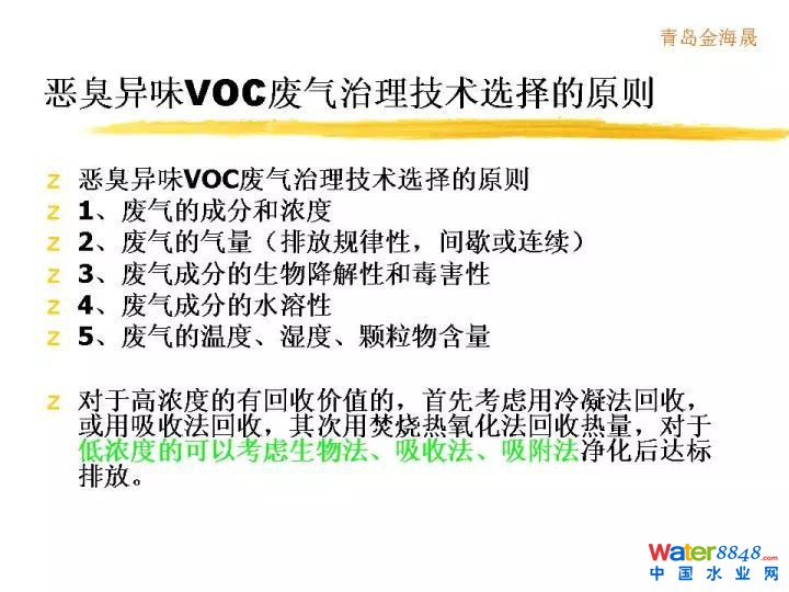 這個(gè)惡臭異味VOC怎么處理呢?有掩蔽法、擴(kuò)散法,這些方法用的少。化學(xué)吸收法,吸附法,生物處理法,低溫等離子,化學(xué)燃燒等等使用較多。大致說這些廢氣怎么解決呢?我們也有好多的方法。這個(gè)大略可以選一個(gè)處理方法。廢氣濃度高,氣量不是很大,這時(shí)候可以采用冷凝辦法回收。可以采取洗滌,焚燒辦法。采用低溫濃縮辦法,吸附辦法等等。最重要的就是我們畢竟搞環(huán)保的,對(duì)于生物法都最為拿手,所以我們就想既然是廢氣里面這些有機(jī)物跟污水里面有機(jī)物都有相同之處,可以用微生物把他們干掉。對(duì)一些低濃度,大風(fēng)量的這樣一些廢氣最合適用微生物辦法解決。就是生物法。