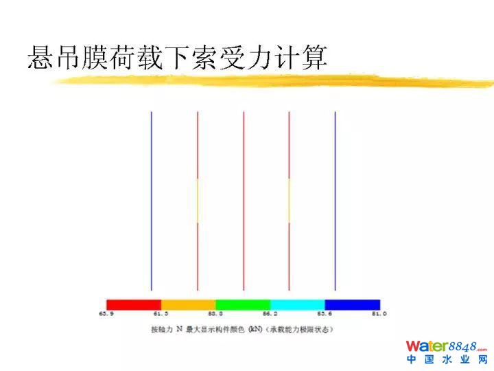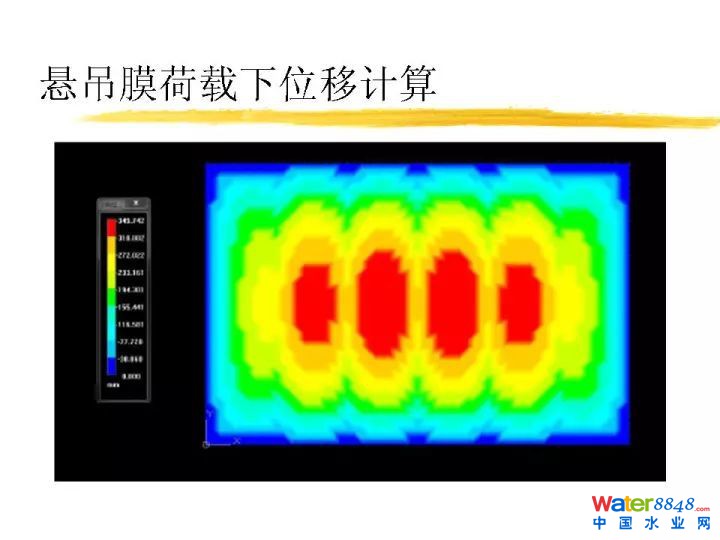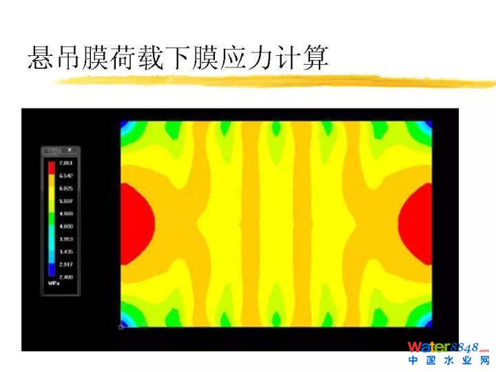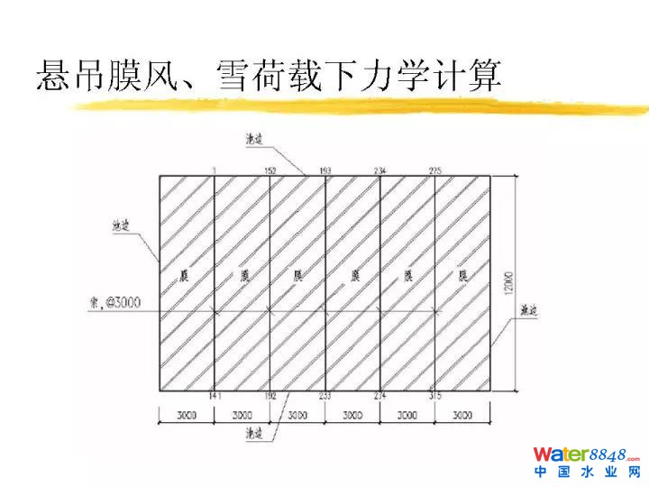 作為懸吊膜大家可能經(jīng)常關(guān)注這么幾個(gè)問題,第一個(gè)下雨怎么辦,非常簡(jiǎn)單,開有落水口。我們封一個(gè)污水池子,這是懸吊膜荷載下膜應(yīng)力計(jì)算。這個(gè)應(yīng)力多大小,相當(dāng)于膜許用應(yīng)力的1/10。這個(gè)保險(xiǎn)系數(shù)達(dá)到十倍,非常安全。這是懸吊膜荷載下索受力計(jì)算,也非常安全。再一個(gè)如果下雪了雪堆上面怎么樣呢?這也是一個(gè)問題。我們針對(duì)這個(gè)做了很多測(cè)定。這個(gè)膜導(dǎo)熱系數(shù)大約0.14瓦每米每K。常用膜厚度1毫米。溫差設(shè)定為10度。冬季很冷時(shí)水溫也會(huì)低于10度。假設(shè)溫差10度,一平方米的膜變傳熱1400瓦,相當(dāng)一平方米加1400瓦的電熱器。雪一旦落上去很快熔化變成水排放掉了。不用擔(dān)心這個(gè)雪荷載的問題。這個(gè)雪融化速度多少?一平方米一小時(shí)可以融化15公斤雪。即使一下子積四十公斤雪在上面要兩個(gè)多小時(shí)化完,雪下完基本融化完了,不用擔(dān)心它的問題。沒有計(jì)算之前常識(shí)感覺不可能會(huì)積多少雪,實(shí)際這個(gè)膜結(jié)構(gòu)跟普通做建筑膜結(jié)構(gòu)不一樣。比如做車棚里面外面可能溫度一樣,比如體育場(chǎng)體育看臺(tái)雪積上面,會(huì)帶來較大的雪荷載,我們蓋污水池上面,污水池里面溫度跟污水一樣溫度,有十度的傳熱溫差,相當(dāng)于每個(gè)平方米上面拿1400瓦的熱不斷烘著它,雪立刻化掉。