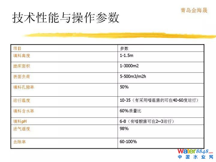 在這里我們可以列一列,歐洲對(duì)于各種不同工藝的投資,還有運(yùn)營(yíng)費(fèi)用做一下統(tǒng)計(jì)。這是惡臭異味VOC處理原則,首先得評(píng)估成分,濃度,氣量,排放規(guī)律性等。這個(gè)是生物除臭需考慮的因素。這是不同生物除臭工藝的特點(diǎn)和適用性。分為生物洗滌、生物滴濾、生物過濾。有什么區(qū)別?從微生物固定狀態(tài),液相流動(dòng)狀態(tài),廢氣水溶性,適用濃度,含塵量等決定所用工藝。技術(shù)參數(shù)不多講了。這是操作指標(biāo),這是去除效率。這是我們做的實(shí)際案例。我們從2004年就開始做臭氣處理,是臭氣處理歷史比較悠久的單位。項(xiàng)目案例各種各樣,非常多。謝謝。