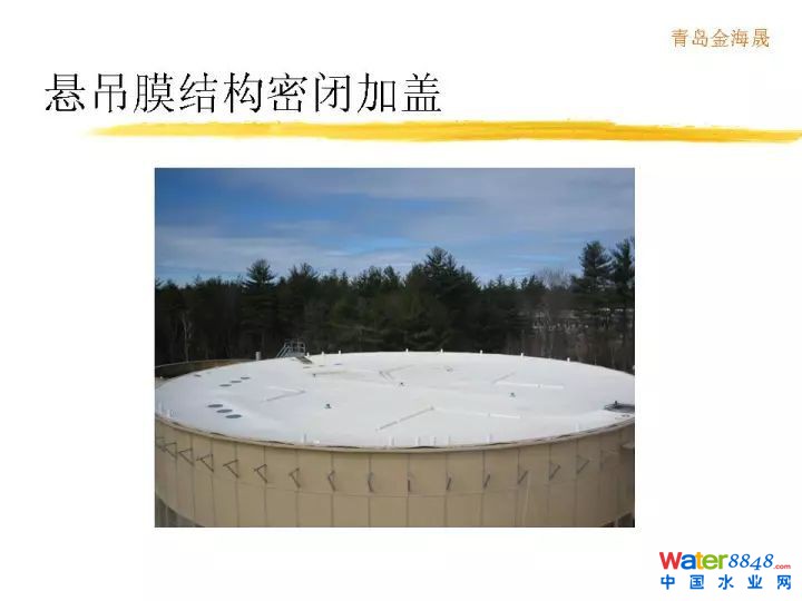 重點(diǎn)講一講我們?nèi)〉玫膶@膽业跄ぃ芷降陌岩粋(gè)池子蓋起來了,這樣它的最大的好處就是膜的這一個(gè)面積達(dá)到最小化,膜密閉空間也最小化。這對(duì)氣體收集最好的。氣量得到非常大的減小。這是它的最大的優(yōu)點(diǎn)。這是實(shí)際工程照片。這是圓形池照片。人站上面都沒有問題,膜看似顫悠悠,實(shí)際強(qiáng)度非常高。人上來走之后不像走在一個(gè)剛性屋面那么穩(wěn),這個(gè)膜有一點(diǎn)彈性。強(qiáng)度沒有問題。