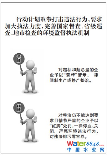 《水十條》重拳打擊違法行為,要求加大執(zhí)法力度,完善國(guó)家督查、省級(jí)巡查、地市檢查的環(huán)境監(jiān)督執(zhí)法機(jī)制。實(shí)行“紅黃牌”管理,對(duì)超標(biāo)和超總量的企業(yè)予以“黃牌”警示,一律限制生產(chǎn)或停產(chǎn)整治;對(duì)整治仍不能達(dá)到要求且情節(jié)嚴(yán)重的企業(yè)予以“紅牌”處罰,一律停業(yè)、關(guān)閉。嚴(yán)懲環(huán)境違法行為,對(duì)違法排污零容忍。