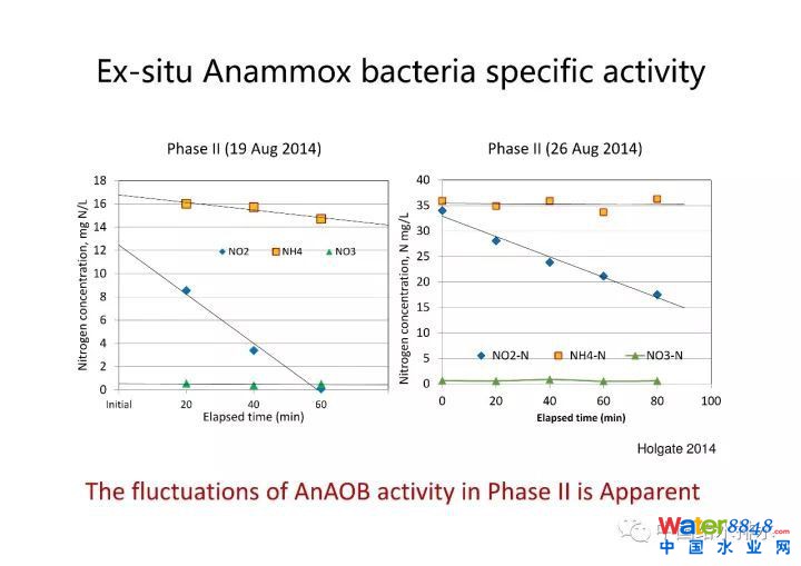 今天污水處理的根本難題是碳管理。在傳統(tǒng)的生物處理過(guò)程中,原水當(dāng)中的碳服務(wù)于兩個(gè)目的,一個(gè)營(yíng)養(yǎng)物去除,第二個(gè)送到硝化池里面產(chǎn)生沼氣。營(yíng)養(yǎng)物標(biāo)準(zhǔn)嚴(yán)格時(shí)實(shí)際沒(méi)有多少碳源可以用作能源回收的。因此,發(fā)展一種營(yíng)養(yǎng)去除不需要碳源的新過(guò)程,就提到議事日程上。氨氮厭氧氧化菌發(fā)現(xiàn)以后,引起了人們的注意。因?yàn)樗梢怨?jié)約60%的溶解氧,且不需要碳源進(jìn)行氨氮去除。這是一個(gè)根本性的變化。就是今天上午彭老師講,碳跟氮去除不用放在一起,可以分開來(lái)處理。理論上來(lái)說(shuō)厭氧氧化全部成功可以把所有碳源拿去做能源回收。美國(guó)的切薩皮克(Chesapeake.) 地區(qū)有很嚴(yán)格排放標(biāo)準(zhǔn)。BluePlains污水處理廠每年花六百萬(wàn)美元買碳源。這是美國(guó)開發(fā)這項(xiàng)技術(shù)的主要驅(qū)動(dòng)力。歐洲的驅(qū)動(dòng)力是增加能源回收。從國(guó)外研發(fā)來(lái)看,已經(jīng)花費(fèi)六年時(shí)間進(jìn)行改技術(shù)的開發(fā)。而對(duì)國(guó)內(nèi)來(lái)說(shuō),我們相當(dāng)部分的污水碳氮比比較低,如果能夠應(yīng)用這項(xiàng)技術(shù),可以在低碳氮比情況下達(dá)到高標(biāo)準(zhǔn)的營(yíng)養(yǎng)去除。樟宜回用水廠實(shí)行了主流氨氮厭氧化(60萬(wàn)噸每天),工藝是典型的五點(diǎn)進(jìn)料,進(jìn)料以20%的比例進(jìn)每一個(gè)硝化池;亓鞅龋50%)進(jìn)入到第一個(gè)硝化池。硝化池和好氧池容積相同。整個(gè)水力停留時(shí)間為5.6 h。新加坡污水溫度為28 ℃-32℃。 這個(gè)圖是我們從2011年在現(xiàn)場(chǎng)取樣分析的平均值制成。有兩個(gè)典型現(xiàn)象:第一,氨氮不但好氧池里面去除,在厭氧池里也被去除;第二,每個(gè)好氧池的末端的亞硝酸氮濃度遠(yuǎn)遠(yuǎn)高于硝酸氮濃度。短程硝化很明顯。部分硝化率為72%,相當(dāng)于10個(gè)氨氮進(jìn)入好氧去,有7個(gè)氨氮被氧化掉。而這7個(gè)被氧化掉的氨氮中70% 氧化成了亞硝酸,剩余的變成了硝酸根。亞硝酸氧化菌的活性被嚴(yán)重抑制。