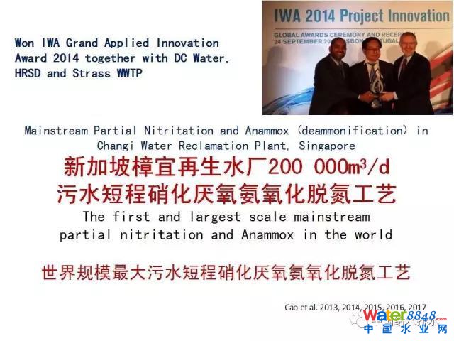 (詳見(jiàn)PPT)目前新加坡樟宜再生水廠,20萬(wàn)噸的主流厭氧消化過(guò)程已經(jīng)報(bào)告了,是世界上最大的部分短程氨氧化和氨厭氧化過(guò)程,并且在2014年,我們跟美國(guó)的兩家水務(wù)系統(tǒng)和Strass廢水處理廠一起贏得了國(guó)際水協(xié)的發(fā)明大獎(jiǎng)。
