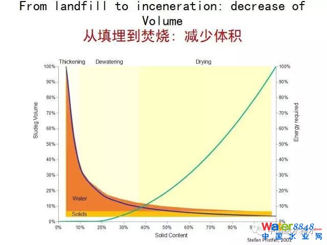 (詳見(jiàn)PPT)這張圖就顯示干化率、污泥體積和能源的需求關(guān)系,新加坡最早是脫水達(dá)到20%含固率以后就進(jìn)行的土地的填埋,但是沒(méi)有多久就填滿填埋場(chǎng)了,所以現(xiàn)在進(jìn)行焚燒處置。據(jù)我所知,在北歐許多國(guó)家焚燒是最后處置方法。當(dāng)然北京、上海最后怎么樣做?我們眼前下結(jié)論還為時(shí)尚早。