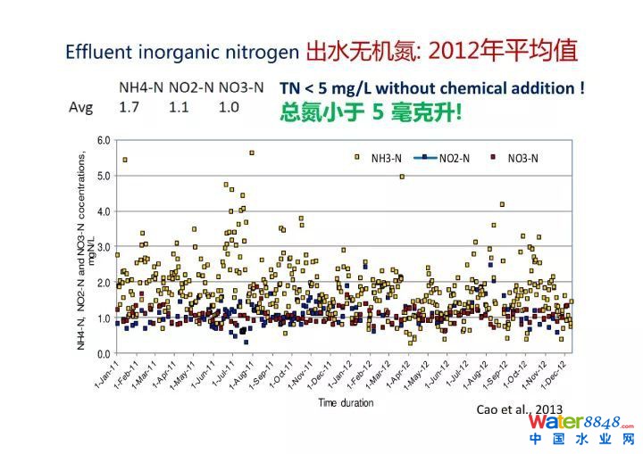現(xiàn)在回到基本的問(wèn)題,跟常規(guī)系統(tǒng)比較優(yōu)點(diǎn)何在?在進(jìn)水水質(zhì)BOD大概為140到150,TN為41,出水TN為 4.8,TN去除率為88.3%;而常規(guī)的過(guò)程出水TN一般高于10mg/L,TN去除率為70%。再看看總氮的組成,它的無(wú)機(jī)氮組成,這一張圖也是2011年數(shù)據(jù),1月1號(hào)到年底,實(shí)際每天早上和下午平均值,每個(gè)平均值做出來(lái),黃的是氨氮,濃度最高。亞硝酸氮濃度為平均值為1.1 mg/L,這個(gè)最有意思的是硝酸根氮的濃度為1 mg/L?偟臒o(wú)機(jī)氮為3.8 mg/L。 而PUB所管轄的其它的常規(guī)污水廠出水的硝酸氮為8-12 mg/L。